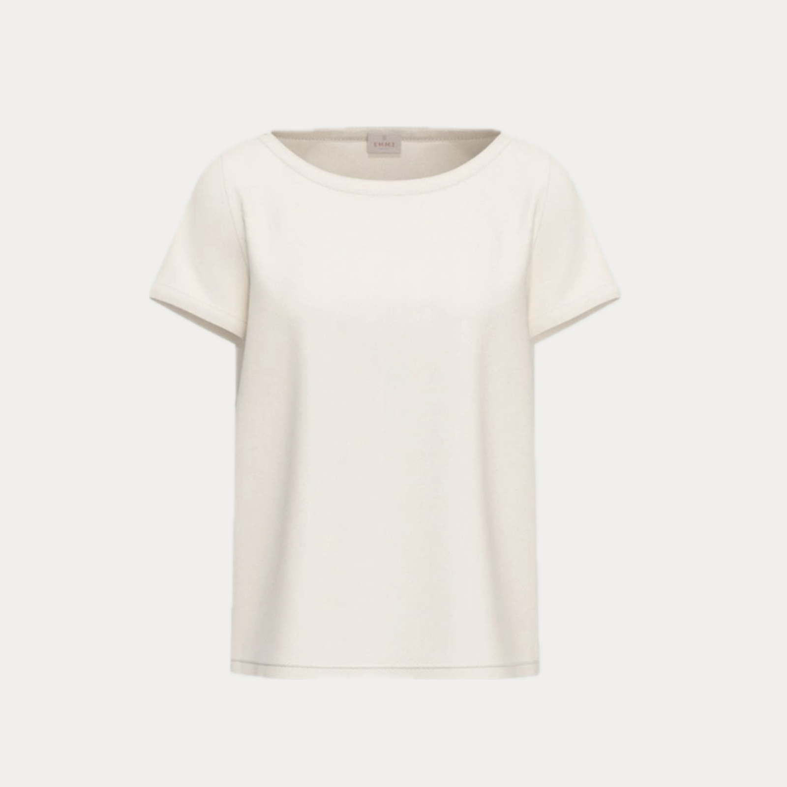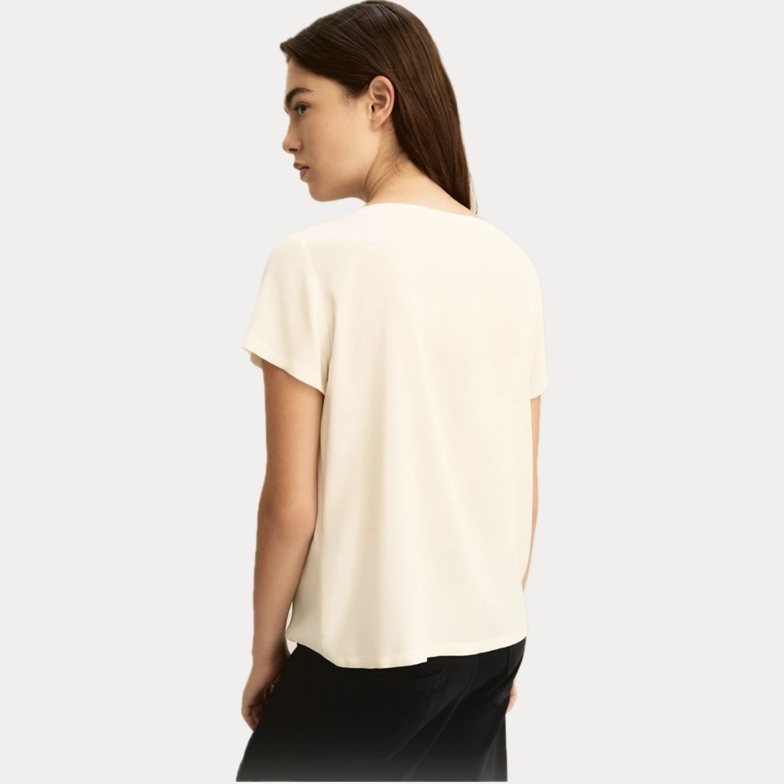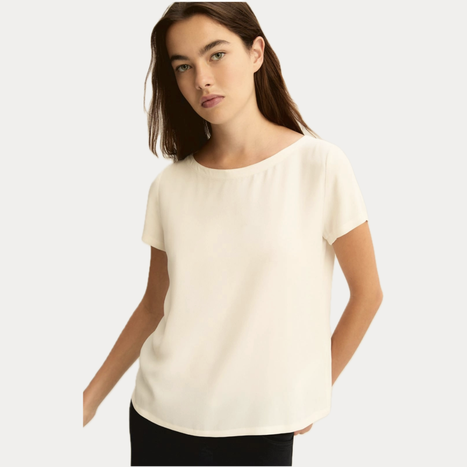 Blusa versatile ed elegante, in crêpe de Chine di misto seta per una nota preziosa sulla pelle. Con manica corta e collo a barchetta ispirato alle marinière anni '80.