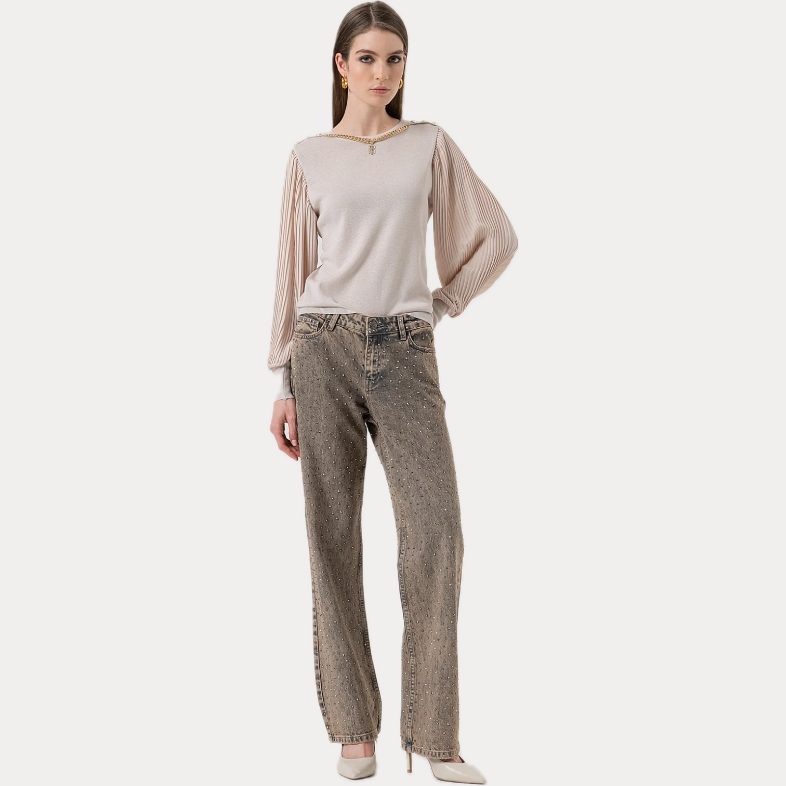 Maglia regular con lana e lurex, girocollo con accessorio gioiello applicato, e con maniche a palloncino lunghe in georgette plissettato.