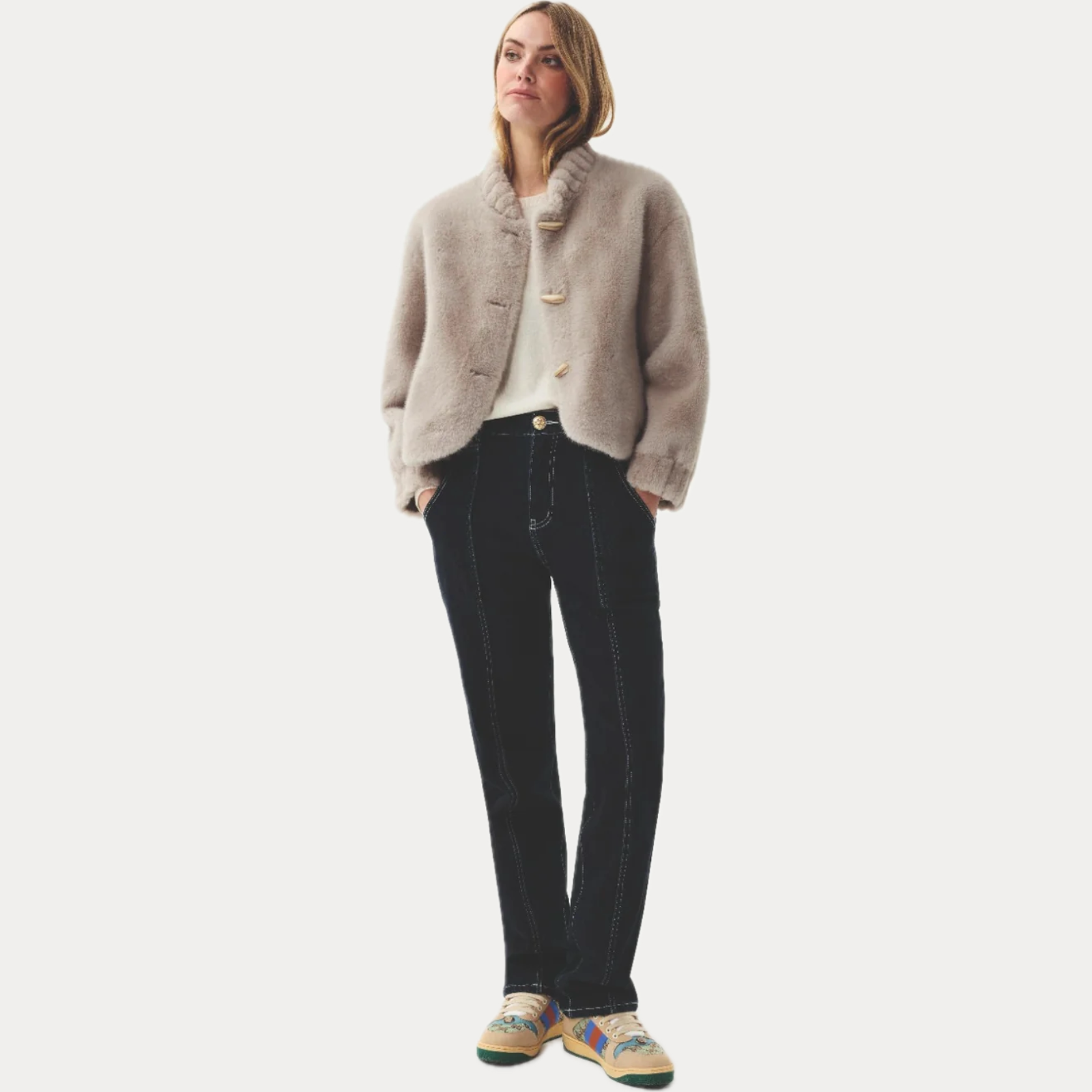 Pelliccia donna corta girocollo con chiusura con alamari.