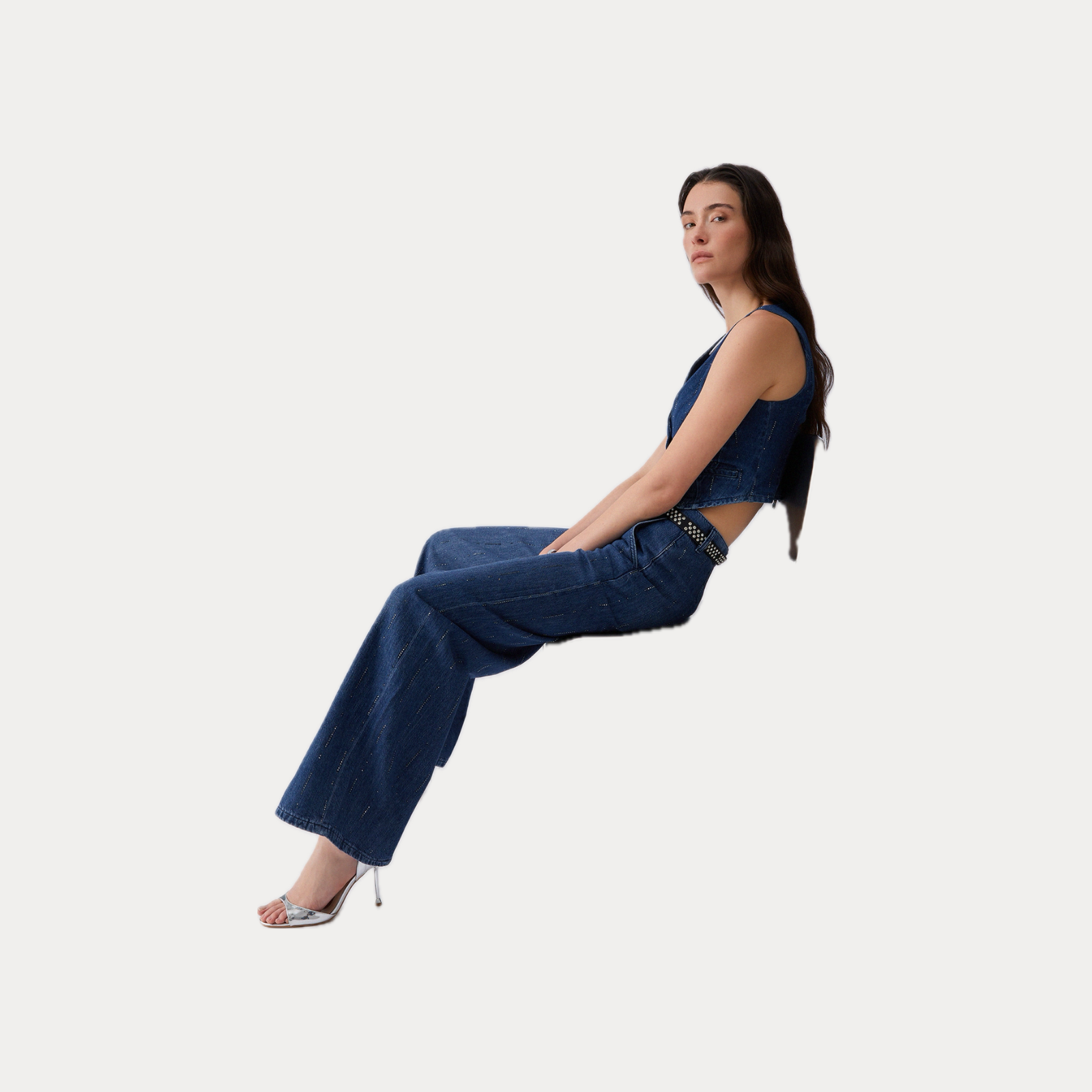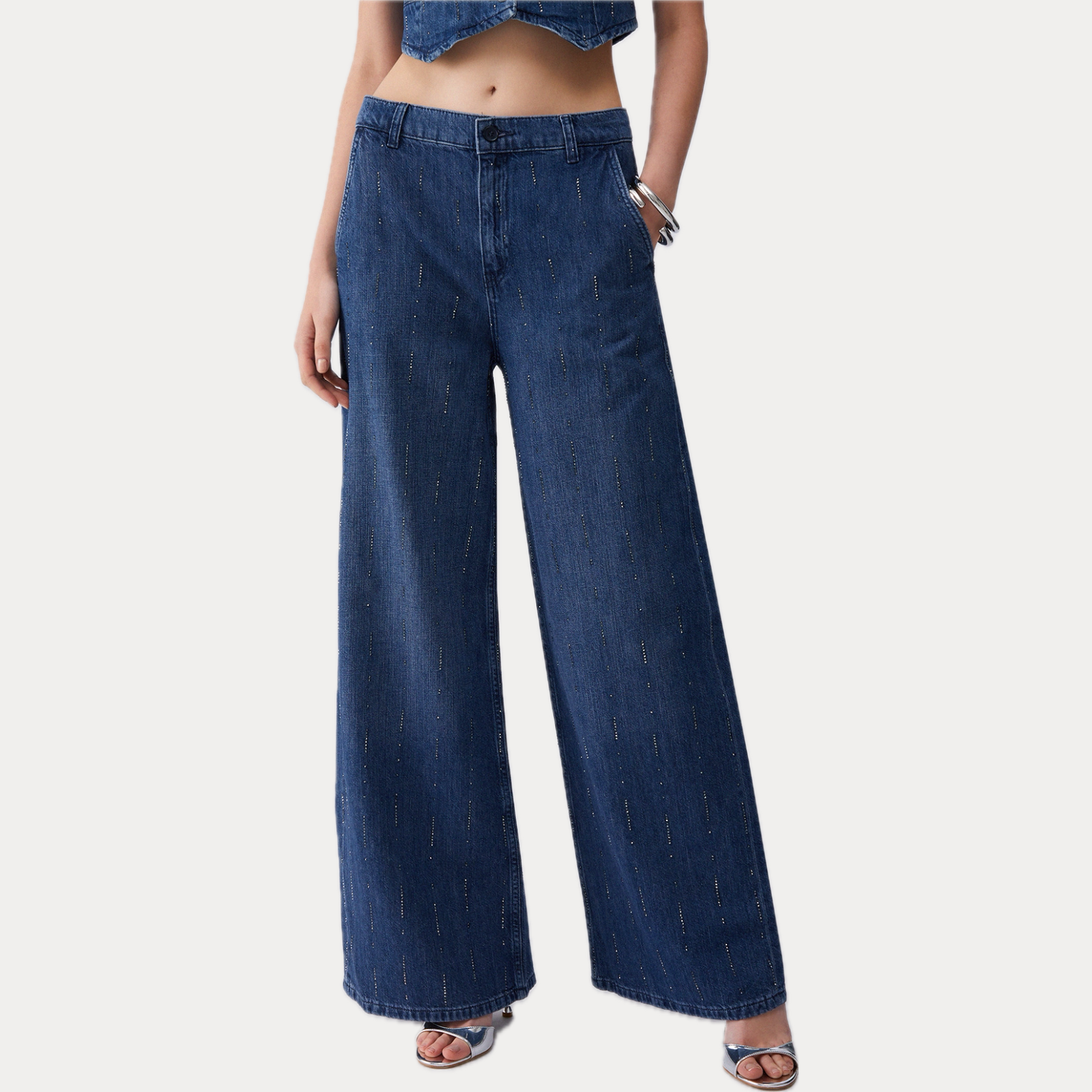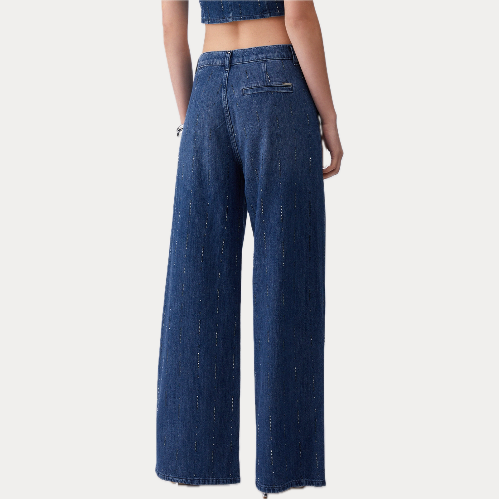 Gamba ampia, lavaggio scuro intenso e una pioggia di strass all-over. Questo jeans da donna slancia la silhouette grazie al taglio flare, perfetto da indossare in coordinato con il blazer.