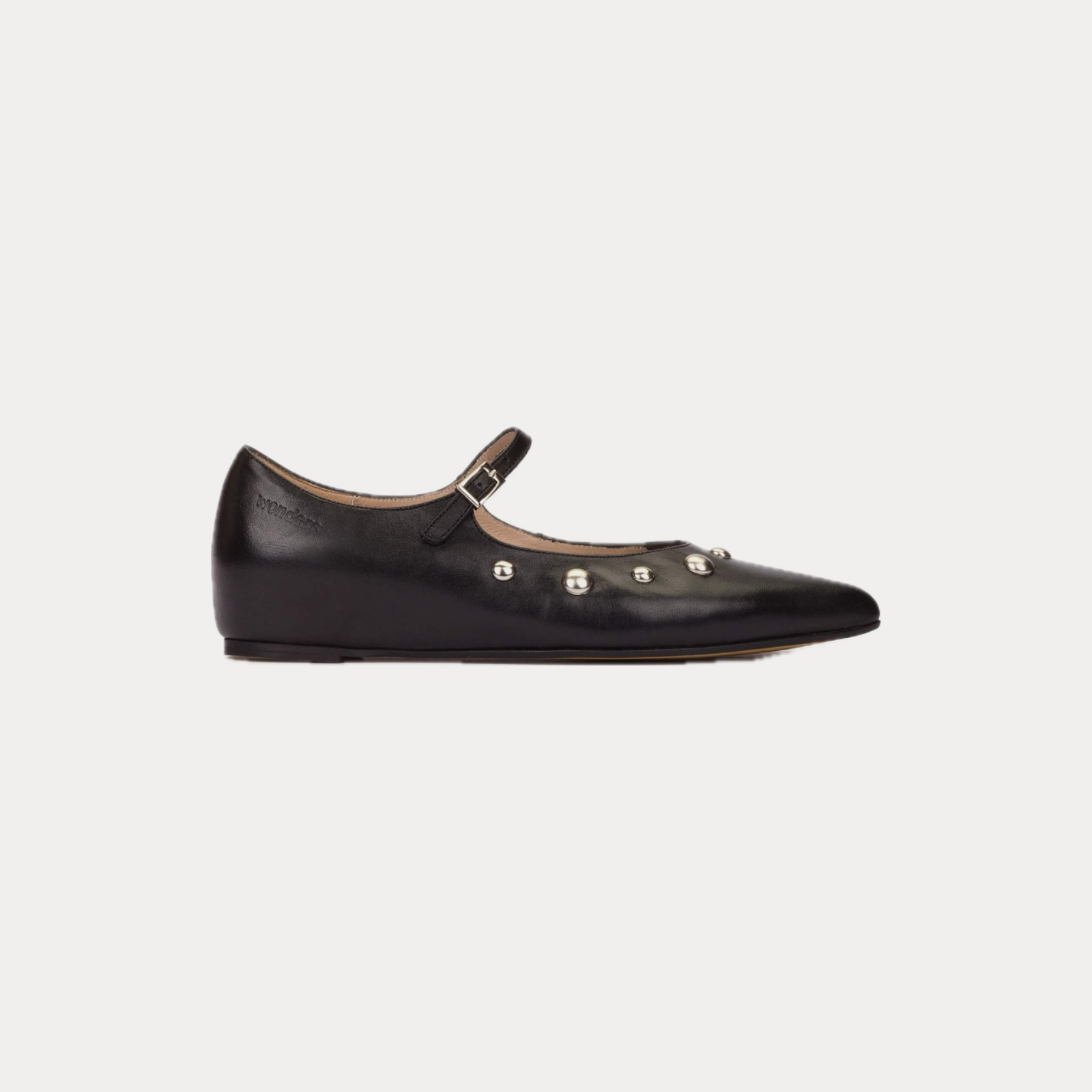 Ballerine in stile Mary Jane realizzate in morbida pelle nera. Un design di ispirazione classica con un tocco moderno, caratterizzato da punta affusolata, fibbia metallica audace e borchie metalliche intorno alla scollatura. La zeppa bassa nascosta aggiunge altezza senza compromettere il comfort. La soletta in MemoryGel ammortizza ogni passo, garantendoti comfort ed eleganza per tutto il giorno. #MadeWithLoveInSpain Wonders si impegna per una produzione responsabile certificata da LEATHERWORKINGGROUP.