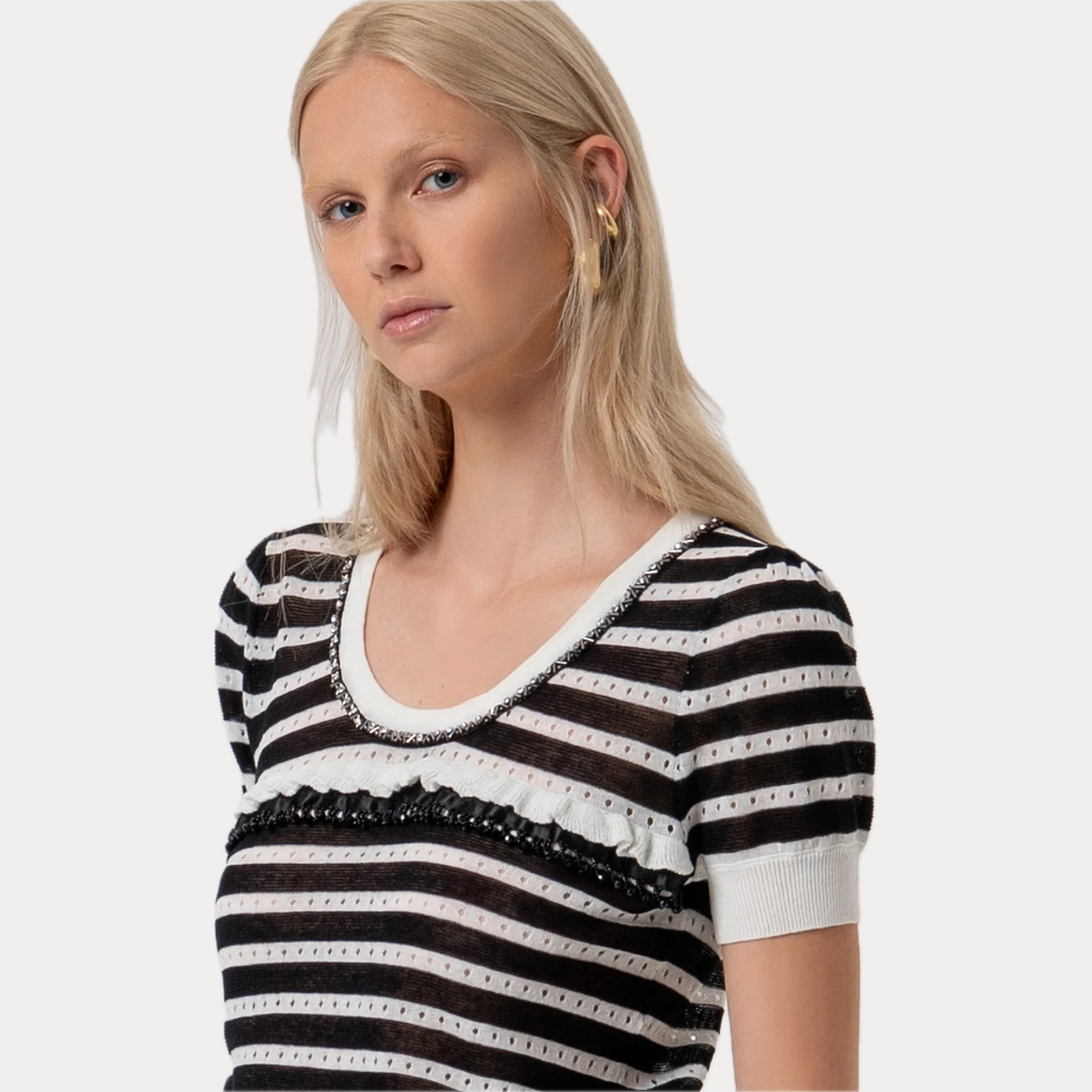 Maglia slim traforata a righe, girocollo, passamanerie applicate, e con maniche corte.