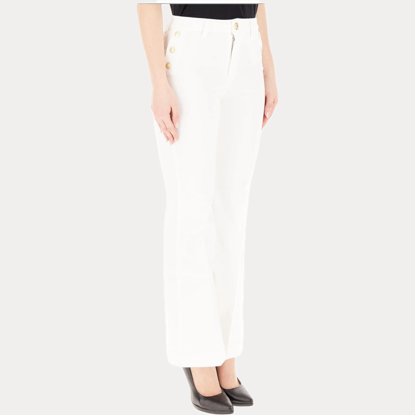 Pantaloni a sigaretta con bottoni decorativi, fondo leggermente ampio.