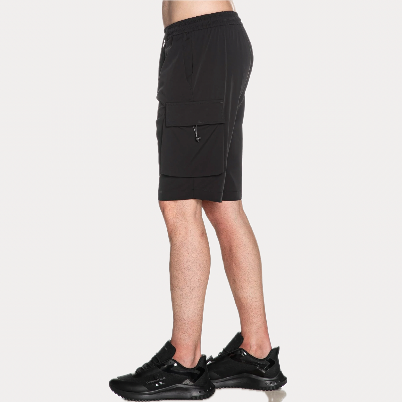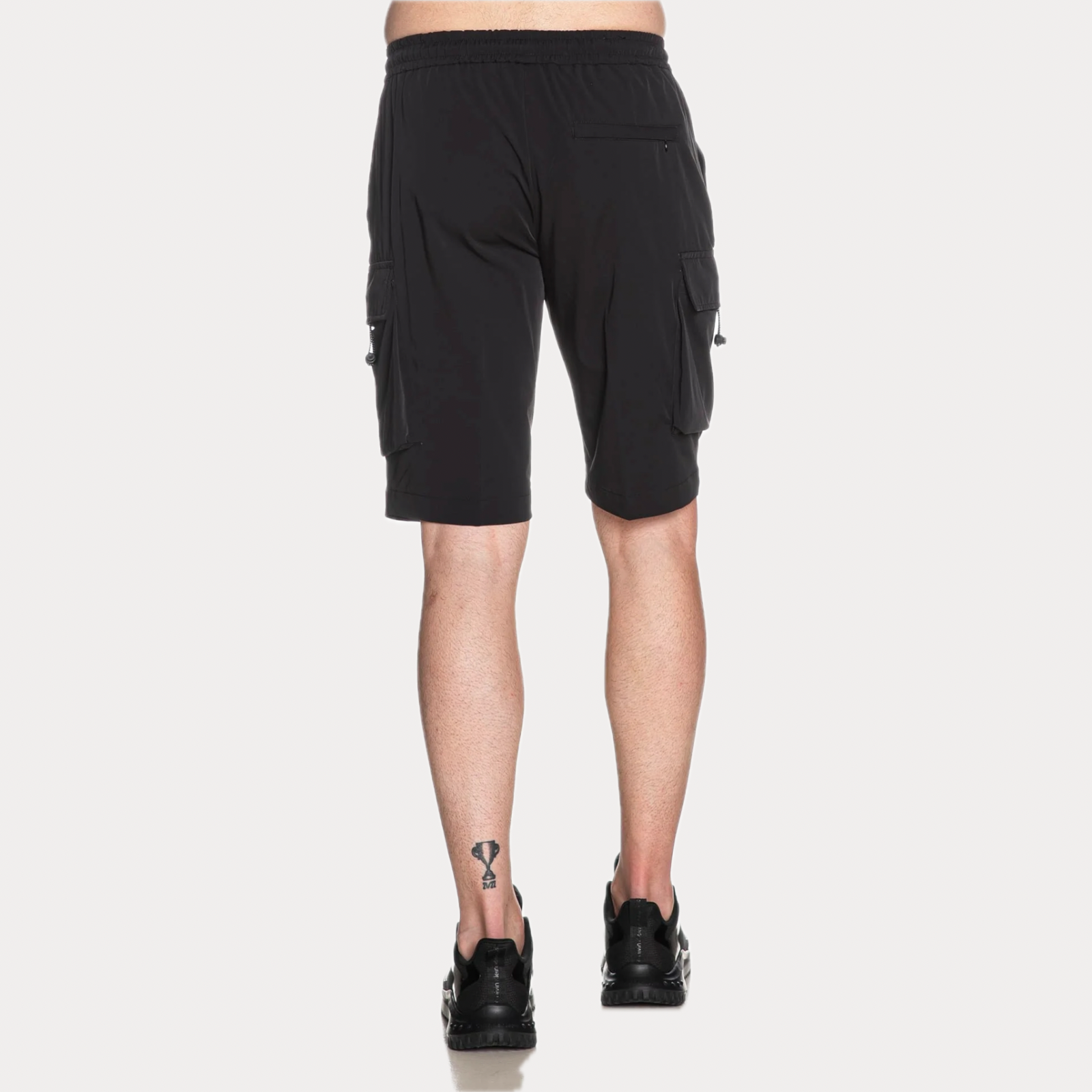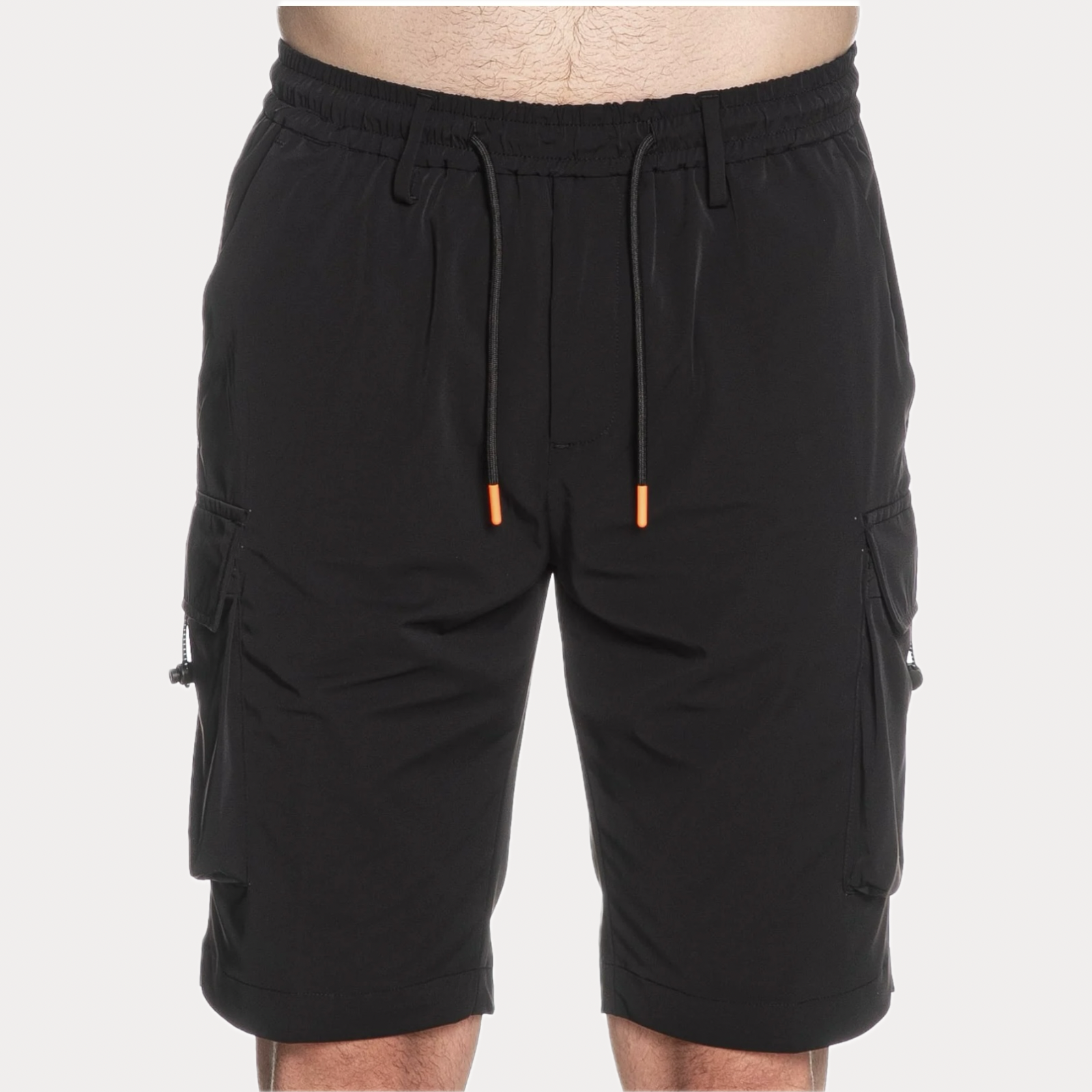Bermuda Markup Tech Hub Cg da uomo in tessuto tecnico di nylon iper stretch, modello jogger cargo, con elastico e coulisse in vita, chiusura zip e tasche america, tasca posteriore a filo con zip coperta e tasconi laterali con patta e stopper di regolazione.