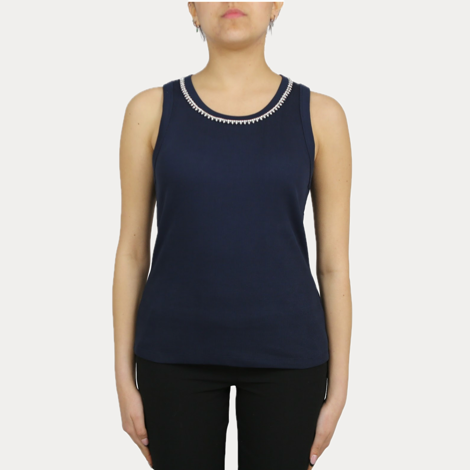 EMME MARELLA - TOP DONNA BLU A CANOTTA CON APPLICAZIONI SUL COLLO
